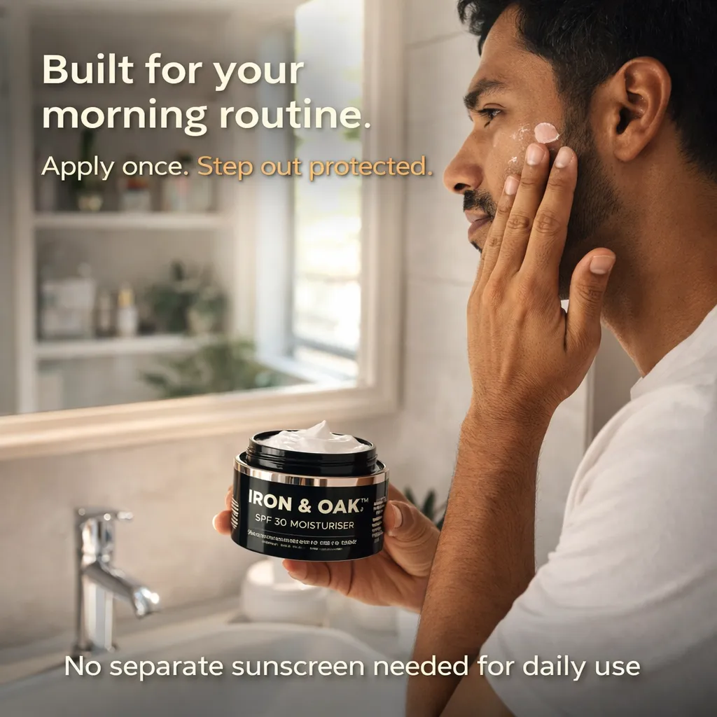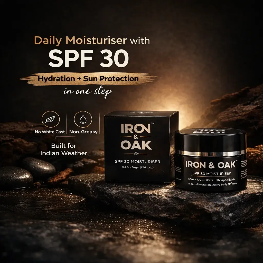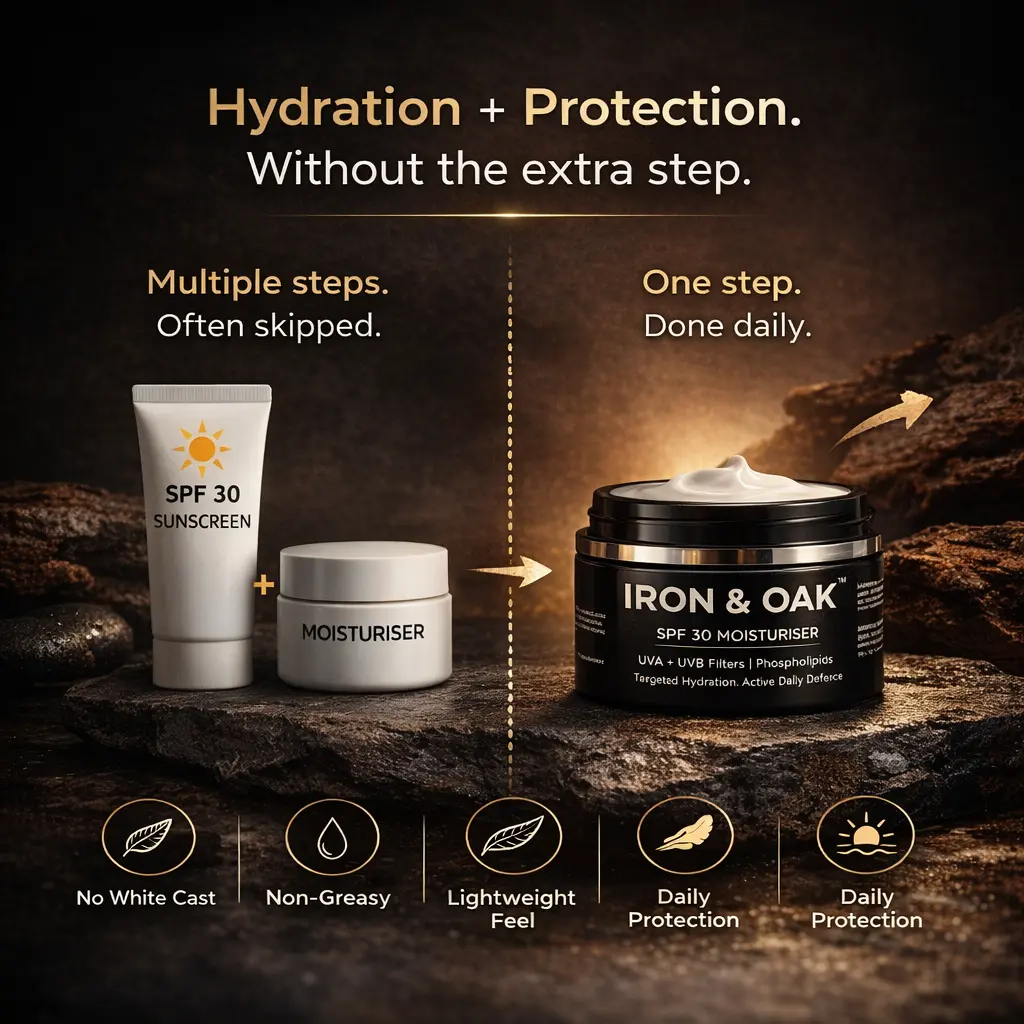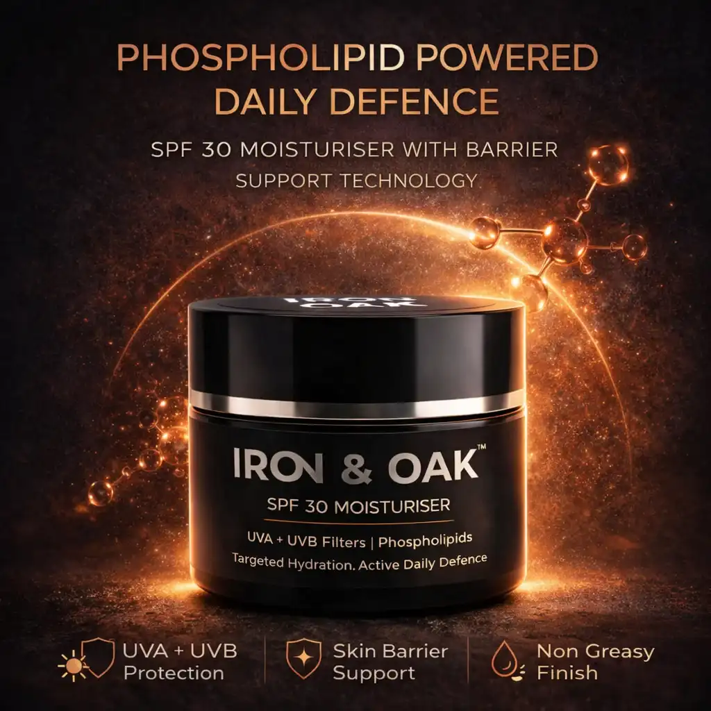 Iron & Oak SPF 30 Moisturiser is a modern-day essential that redefines what daily sun care should feel like: protective, nourishing, and effortless. At its core is a unique phospholipid-based delivery system, which enhances skin absorption while reinforcing the skin’s natural lipid barrier. These skin-compatible compounds help lock in hydration and improve the spreadability of UV filters, creating a more comfortable, breathable finish compared to traditional sunscreens.